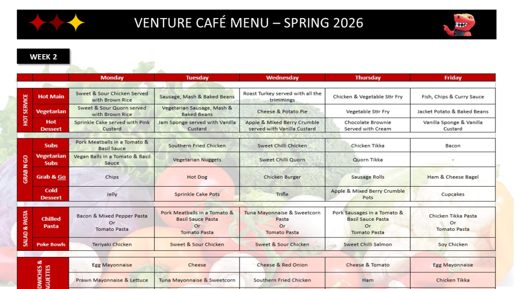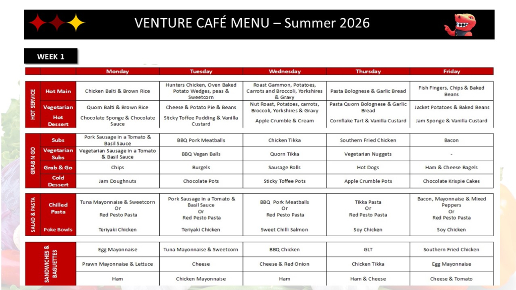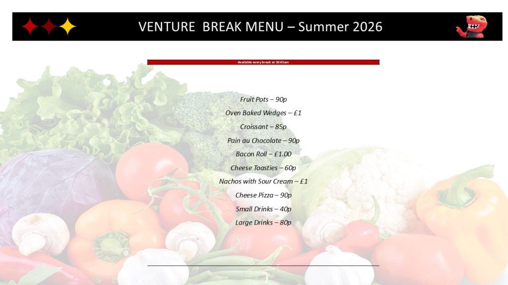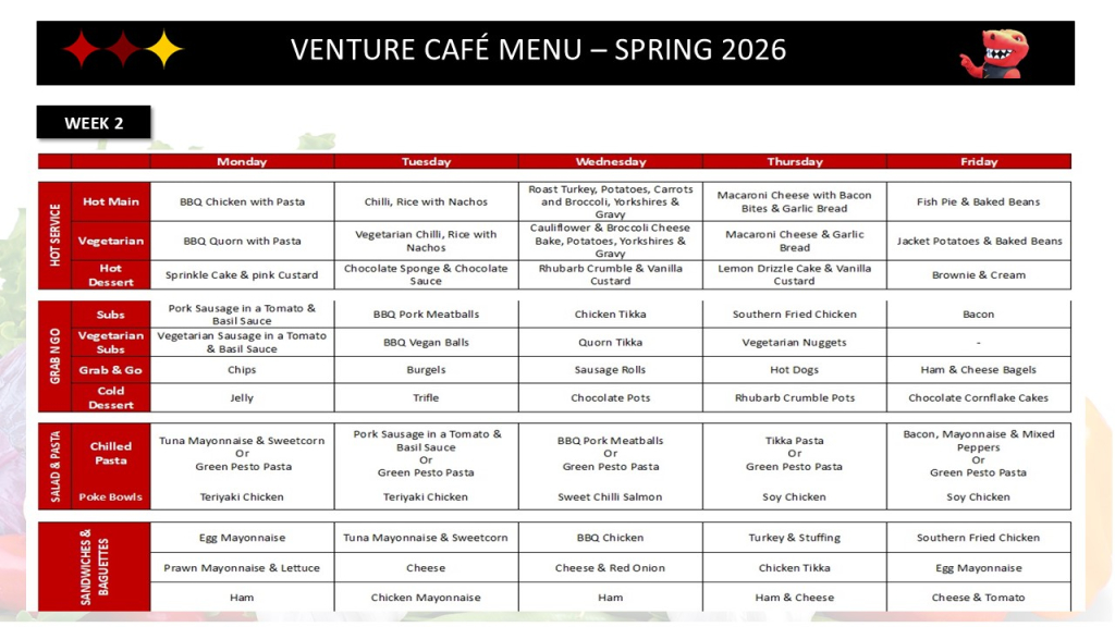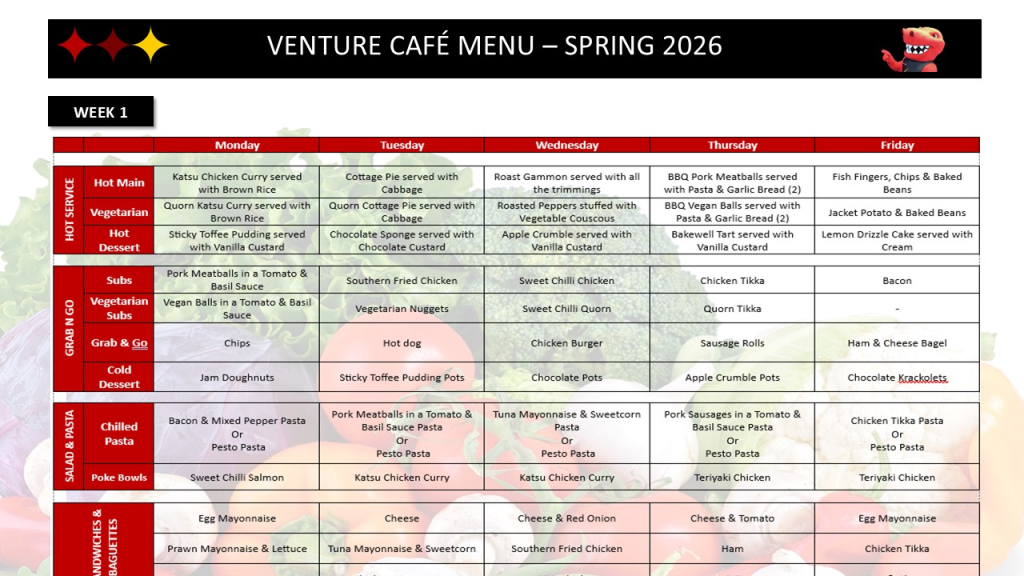 Welcome to ‘The Venture Cafe‘, our modern dining area offers students a range of healthy meals including hot dishes of the day, sandwiches, sub rolls with a variety of snacks and drinks. At Venture we aim to provide a healthy and balanced diet for our students with all food being prepared on site by our own in-house catering team. All menus are reviewed regularly and are changed on a termly basis to meet seasonal changes whilst always aiming to meet our students tastes. All food served complies with the Schools Food Standards.