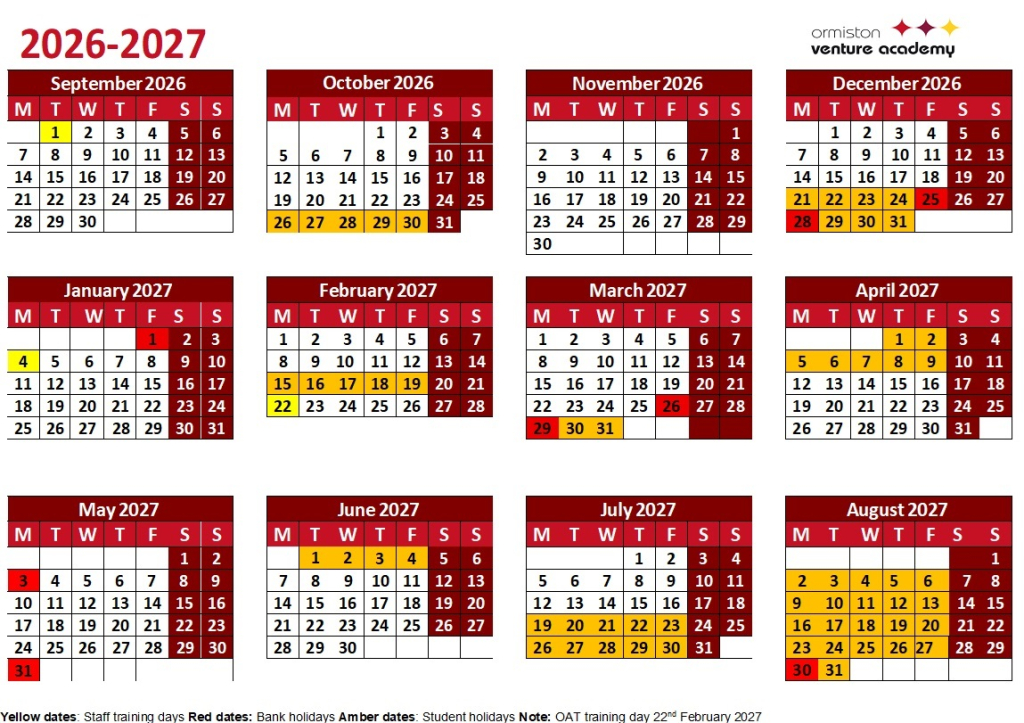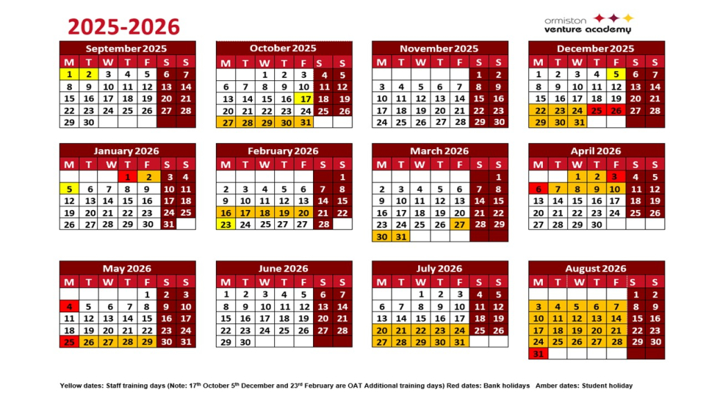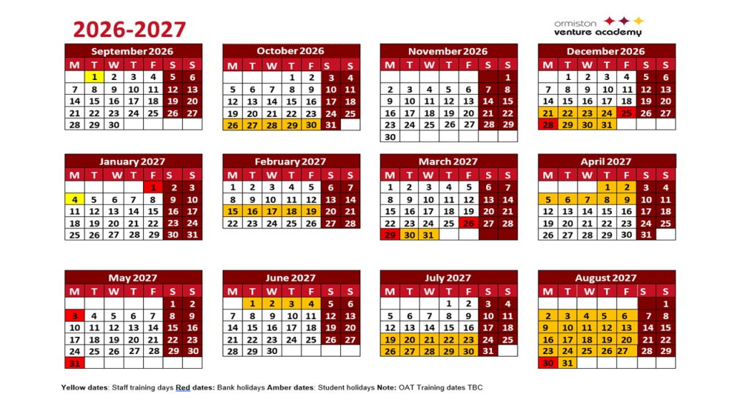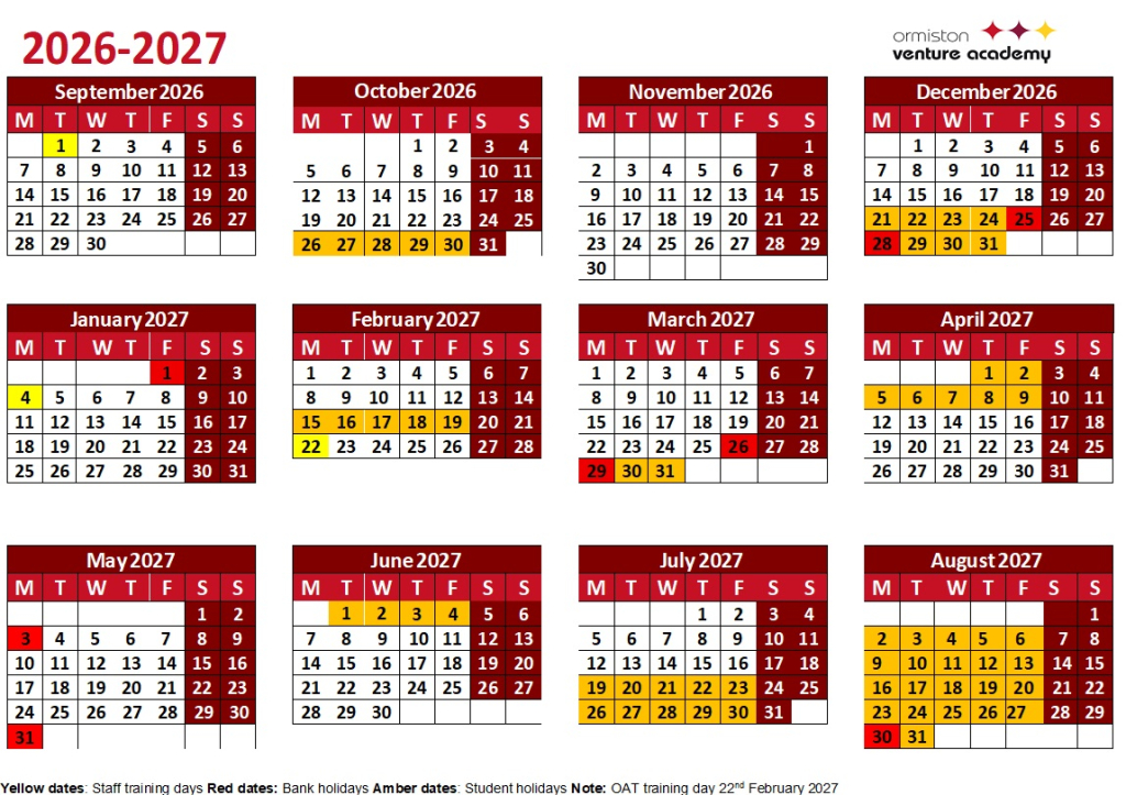 Key: Yellow dates: Staff training days (academy closed for students) Red dates: Bank holidays Amber dates: Student holiday