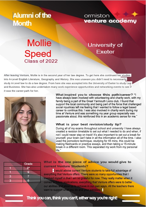 Our support of our students doesn’t stop when they get their results, as Venture Alumni we will always be there to support them and we are extremely proud that whatever our students are doing, they still feel part of the Venture family and they keep us informed of their progress and even come back to help inspire our current student body. Please use the links below to navigate to some of our success stories, we hope you enjoy reading about them as much as we do when we hear about them for the first time.